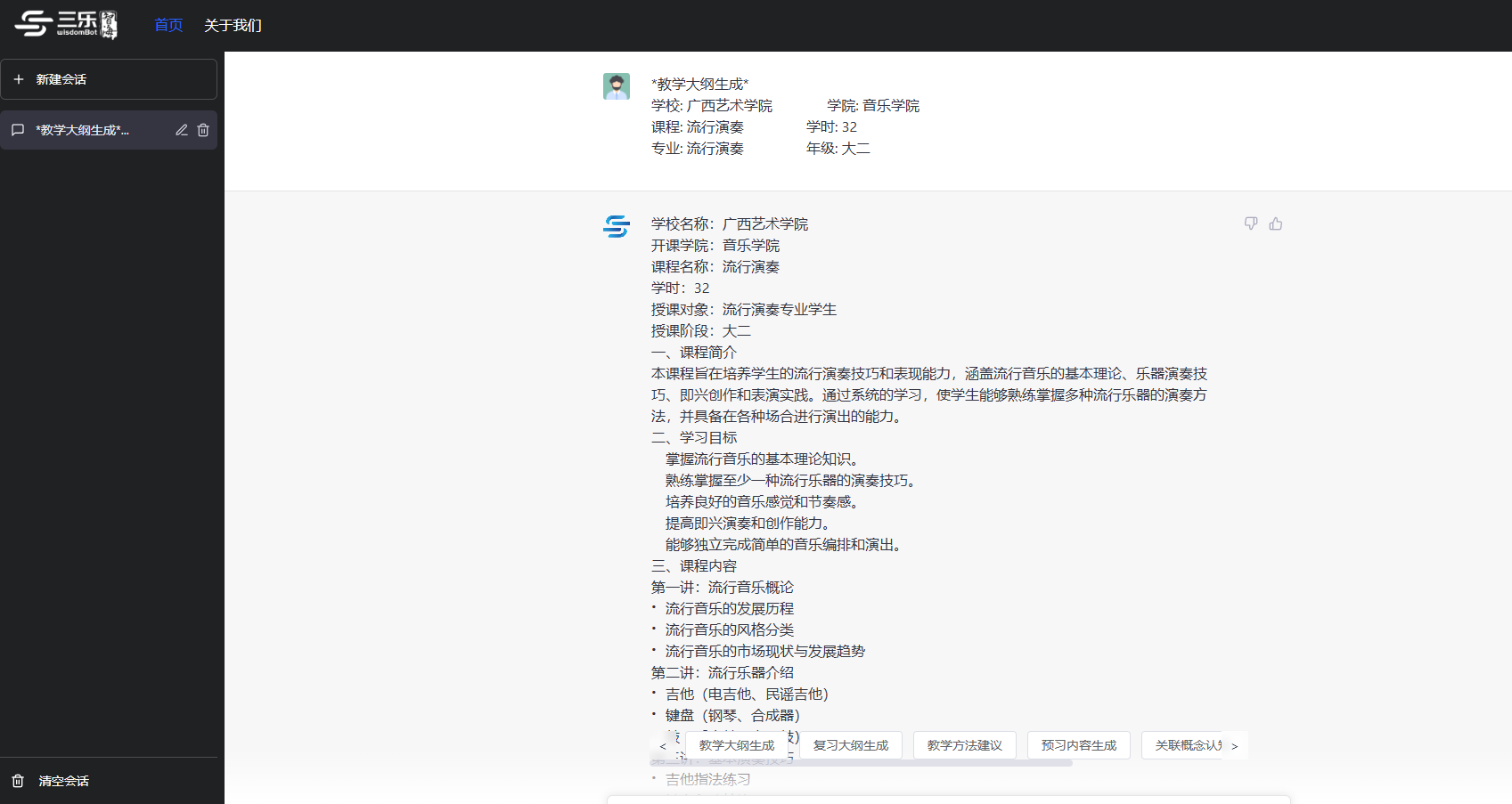 以“人工智能”学科大模型中的“三乐”模型为例,支持教学大纲生成、复习大纲定制、预习内容推荐等功能,赋能教师“创造性教学”。
